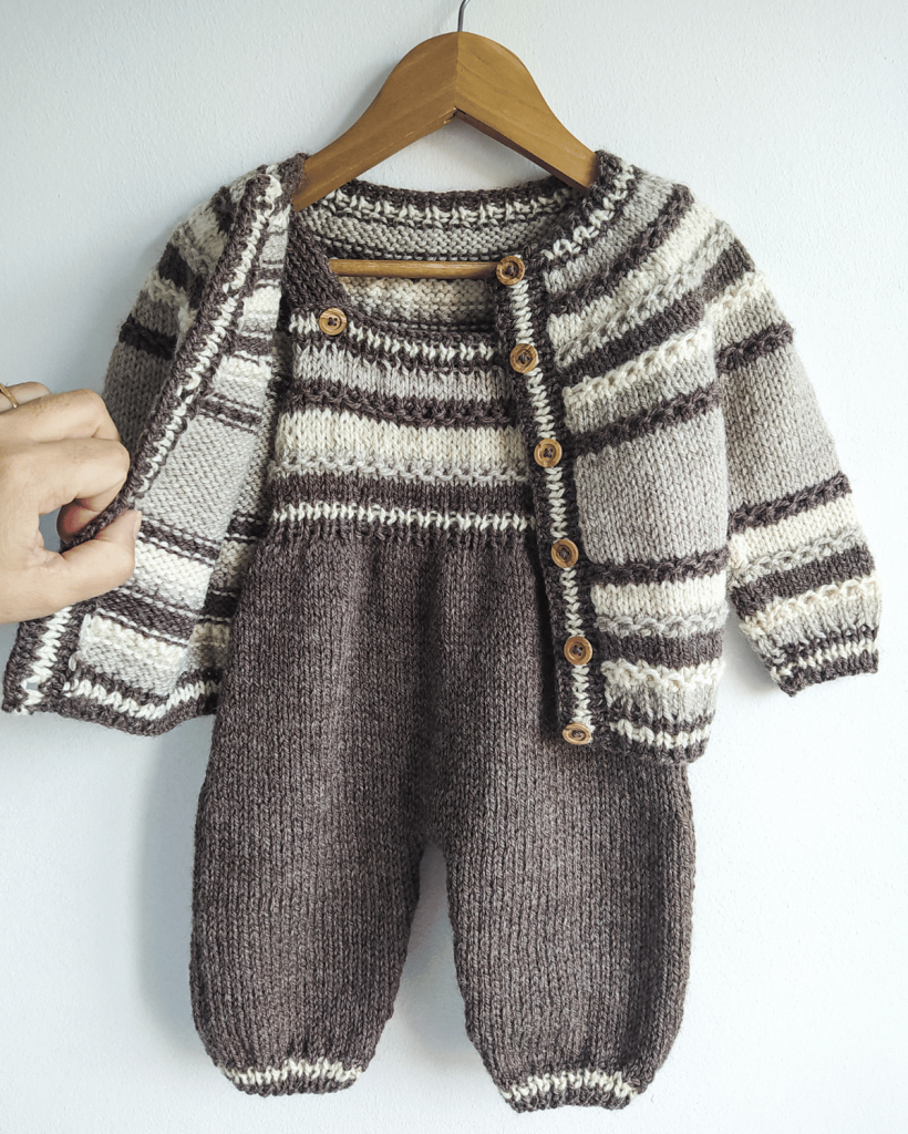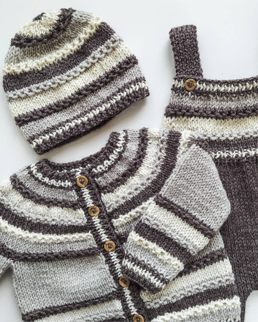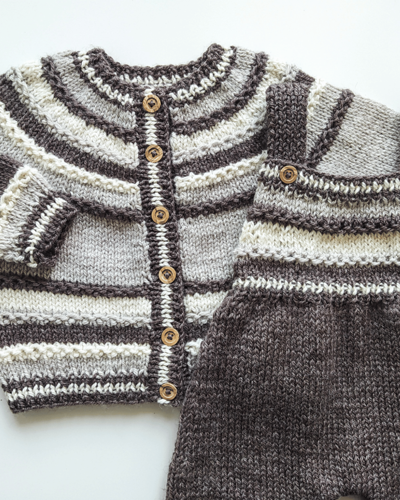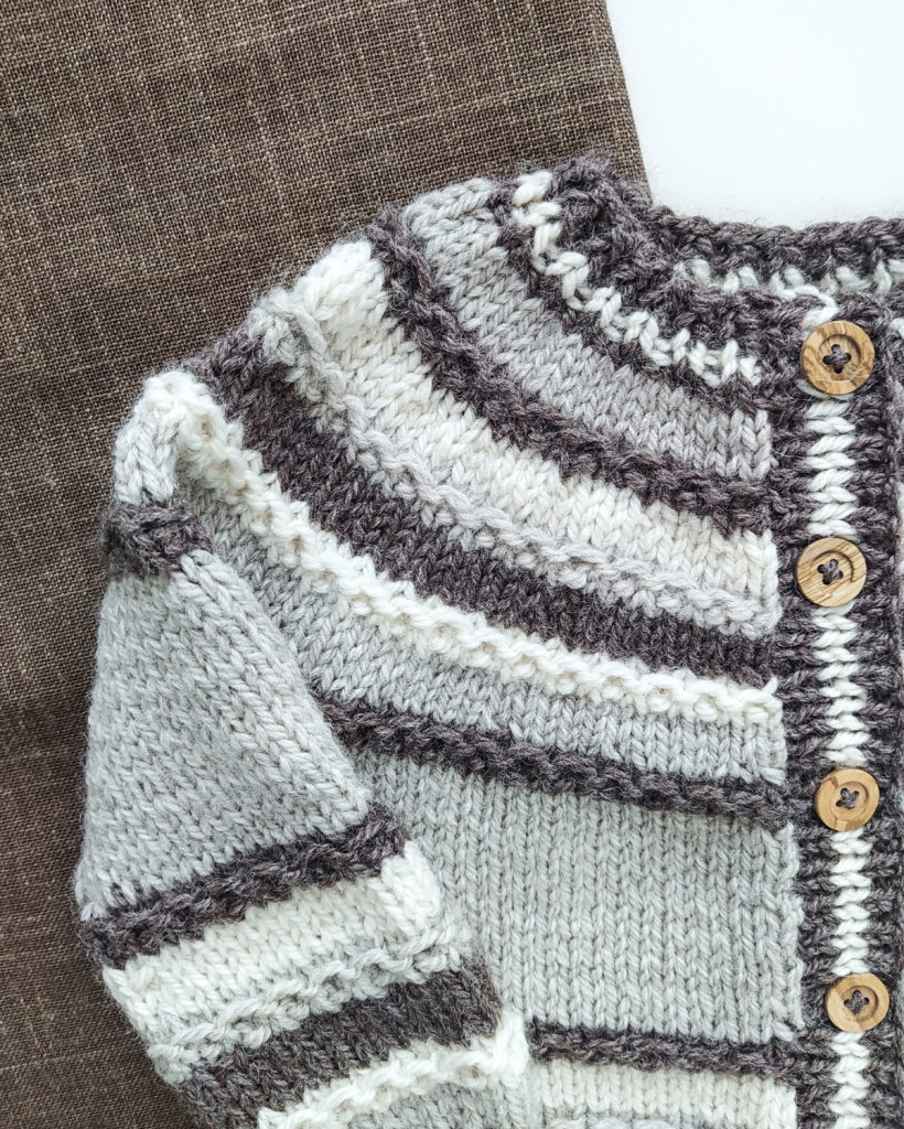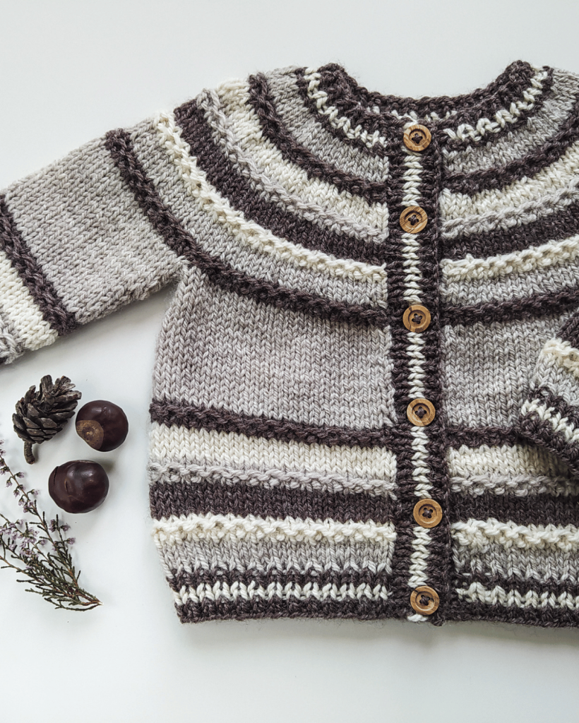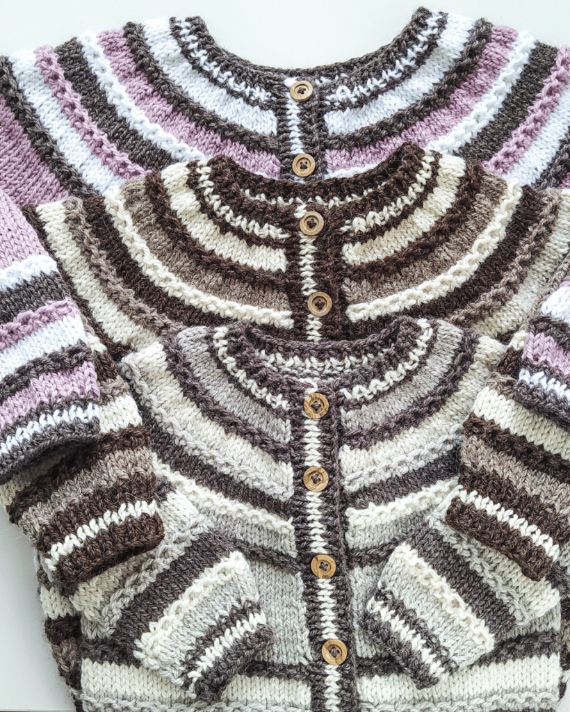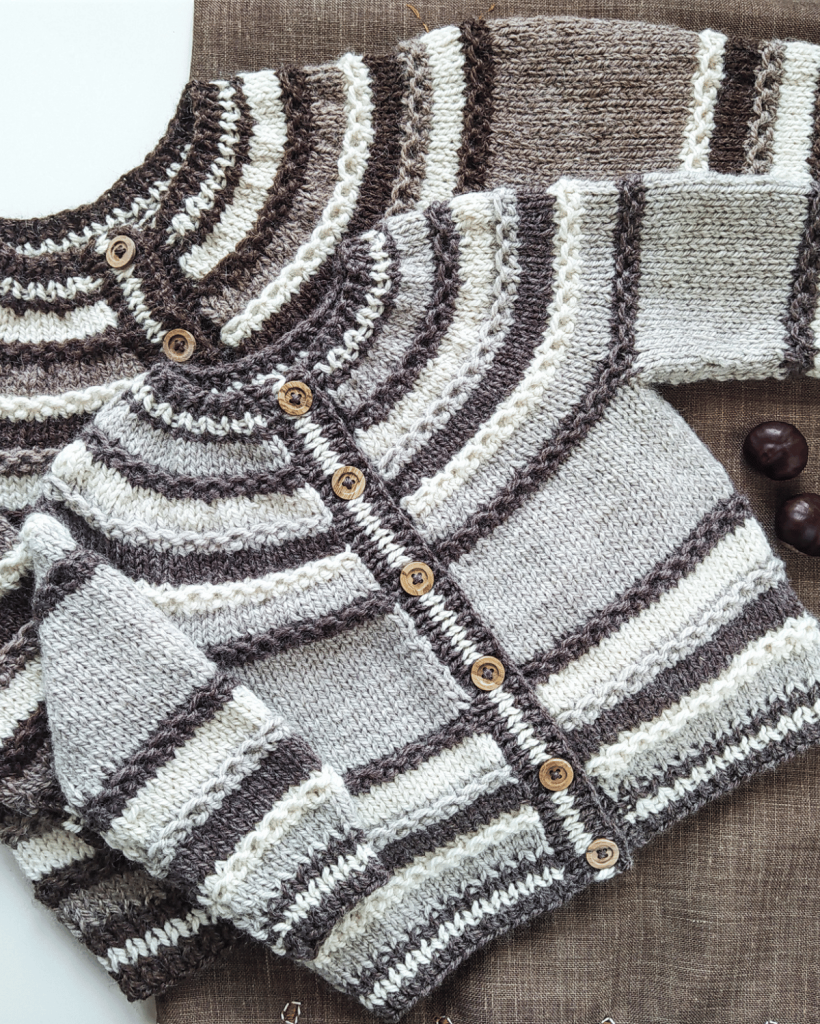 The Saturno Cardigan is a top down cardigan that is knitted in stockinette stitch and Hoops stitch. It is worked in one piece making the necessary increases to shape the circular yoke, with which the sleeves and body and shaped. It is almost seamless, only the sleeves are sewn. The pattern includes a link to a video tutorial for the Hoops stitch used across the pattern. This is a very practical and versatile cardigan that is the ideal go-to for everyday use. Either if you are making it for your children or for a little one you love, this design is guaranteed to be a classic in their wardrobe from now on.